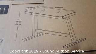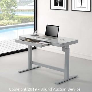 Comes in original box, like new condition. Glass top, integrated touch controls and motor allow you to alternate between sitting and standing easily the press of a button, 4 programmable height settings, white tempered glass top with grey metal frame. Has (3) 2.4 amp USB inputs, powers up to 3 devices at full speed, large partition pencil drawer, height range 29.4" to 47". Approx. 23.7" x 47.3" surface.
