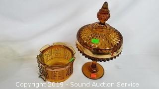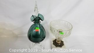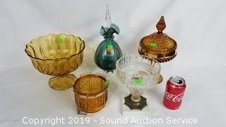 Lot #0176: Art Glass Decanter, 3 Vtg. Compotes &Candle Holder