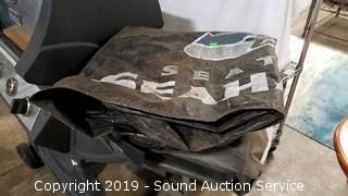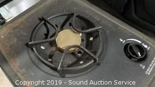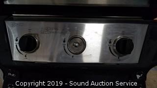 Has a single side burner, missing the middle knob, black and stainless finish, one side on wheels, comes with propane bottle and Seattle Seahawks cover. Overall approx.. 50" H, 62" W, 24" D.