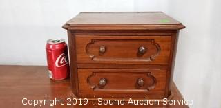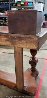 Ornate carved and turned legs, 5 drawers, bottom shelf. Approx. 52" H x 47.5" W x 20" D.