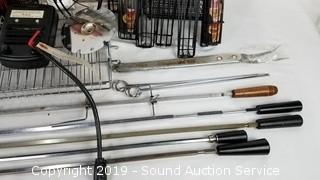 Includes: Rotisserie Motor, Various Baskets, Shish Kebab Grill Baskets, Skewers, Rods, Rotisserie Roast Rack, and Tote.