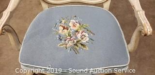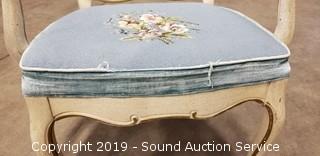 Cabriole legs, needlepoint fabric. Paint has some wear, the fabric is worn.