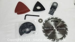 Includes: 5-1/2" Circular Saw w/Blade, Rotating Head Flashlight, Drill, Reciprocating Saw, Battery, Charger, Accessories, Angle Grinder, and Storage Bag. Tested, work. All are in like new condition.