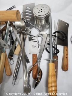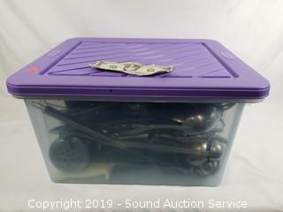 Includes: Can opener, spatulas, serving spoons, whisk tongs, prongs, ladles, and much more. Rubbermaid tote included, approx. 9-1/2" H, 17" x 14-1/2".