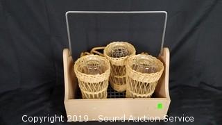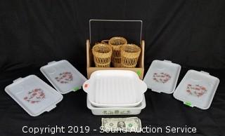 Also comes with wicker cup cozies. Casserole dish is Glasbake, 8" x 8" x 2".