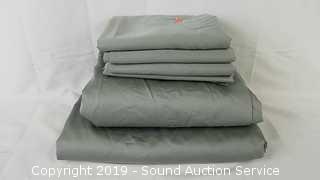 In excellent condition. You get 1 flat, 1 fitted and 4 pillow cases. Gray color.