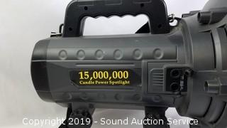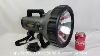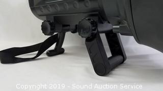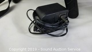 Couldn't get it to turn on, may need a new bulb. Comes with 12V AC charger (red charging light comes on when plugged in, but nothing happens when you turn on the power). Has a built-in stand.