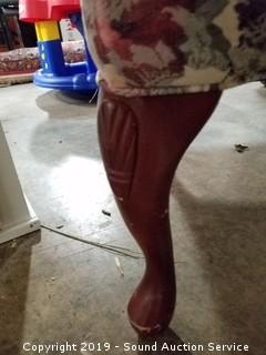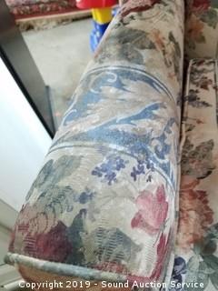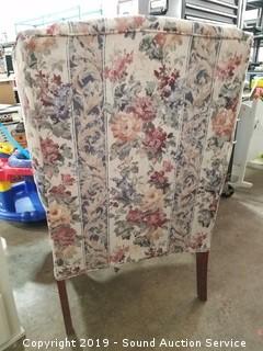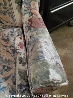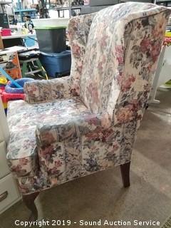 Some damage to the fabric and arms. Comes with a 4ft x 4ft 8" piece of matching fabric. Chair is approx. 44" H, 30" W, 22" wide seat.