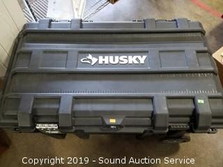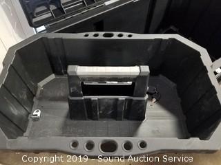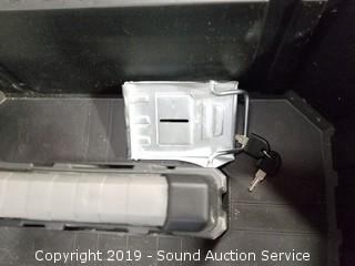 50 gallon capacity, keyed lock with metal latches (One latch is broken off, pieces are present), comes with 2 keys and tool caddy, large wheels, telescopic handle. Overall approx. 23" H, 37" L, 23" D.