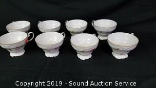 Includes: (8) 7-1/2" Bowls, (8) 10" Dinner Plates, (8) 5" Snack Bowls, (8) Cups, (8) Saucers, (8) 6" Snack Plates, Creamer, Sugar, Salt, Pepper, 12" Platter & 10" Oval Serving Dish. All are gold rimmed and look to be in excellent condition, don' t notice any chips or cracks.