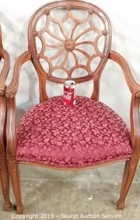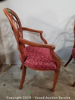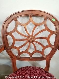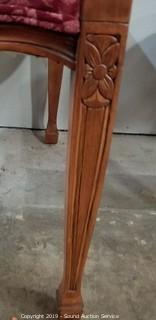 In good condition. Approx. 38" H, 23" W, 20" D. Wine color fabric. Ornately carved arms, legs and scroll work on the back.