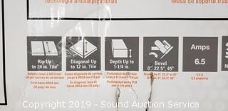 Tested, works. Assembled, lightly used. Comes with table blade attached and extra blade, miter guide, rip guide, and stand.