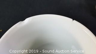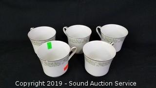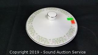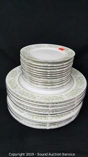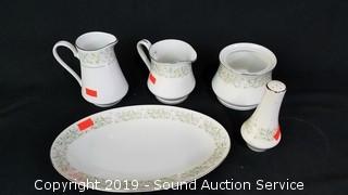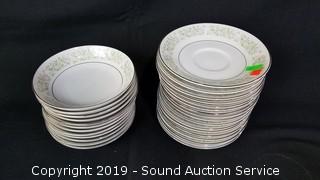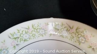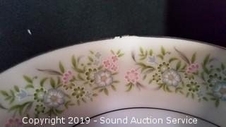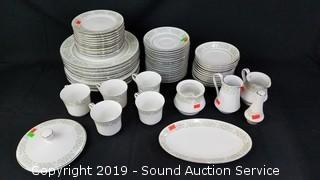 Includes: 17 saucers, 5 cups, (11) 5.5" snack bowls, (12) 5.5" plates, 10 dinner plates, creamer, sugar, salt or pepper shaker, lid, and 9" oval plate. Some small chips.