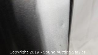 Has a small dent, everything works. 25" H, 17" W, 11" D. Fingerprint resistant, removable liner.