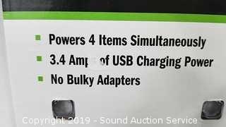 3.4 amp USB charging power. Package has been opened, looks complete.