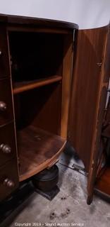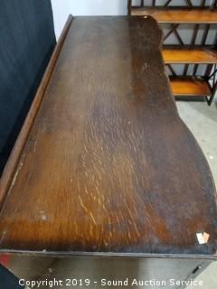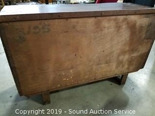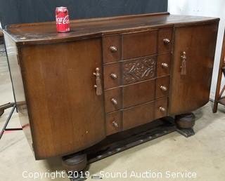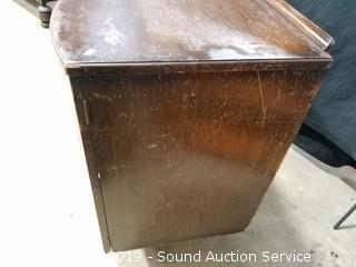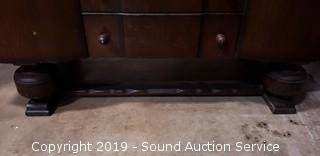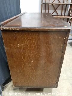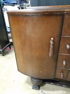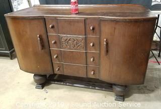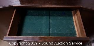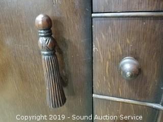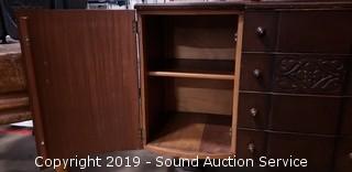 Has 4 drawers (top is felt lined), and 2 side cabinets. Some wear and scuffs to the finish. Approx. 35" H, 54" x 20".