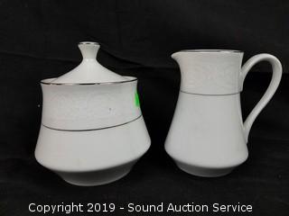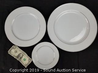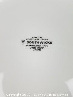 Contains 2 different makers, very similar patterns. Carlton "Plymouth" Includes: 6 Cups, 7 Dinner Plates, 7 Snack Plates, 7 Bowls, 8 Saucers, and 12" Charger. Southwicke Includes: 6 Cups, 9 Dinner Plates, 9 Saucers, Creamer, Sugar, and Covered Serving Bowl.