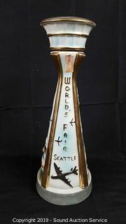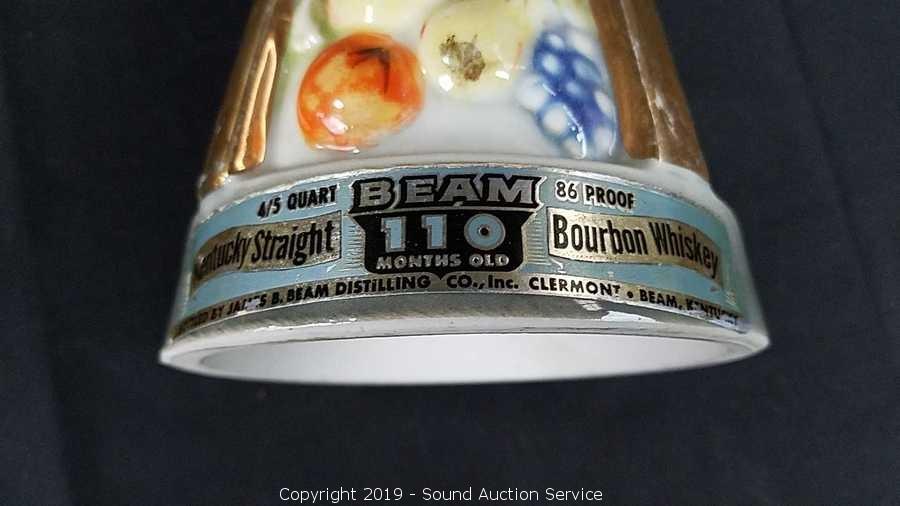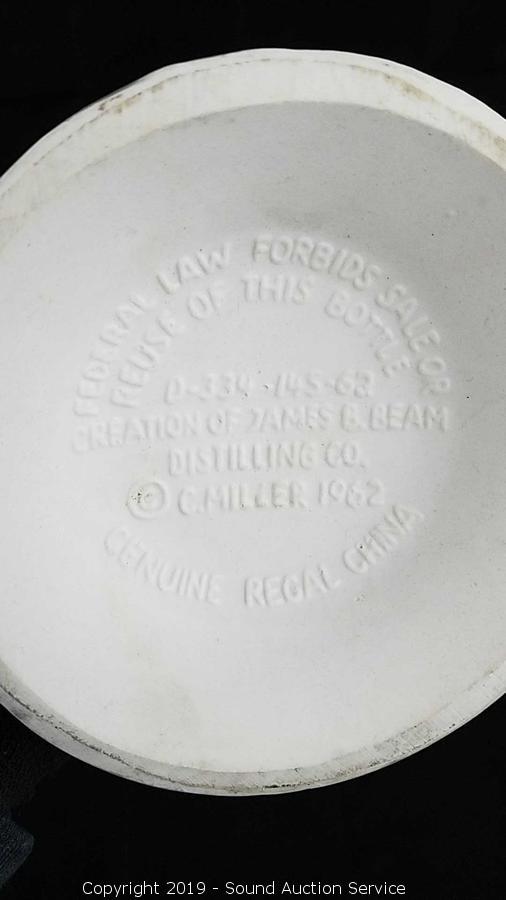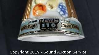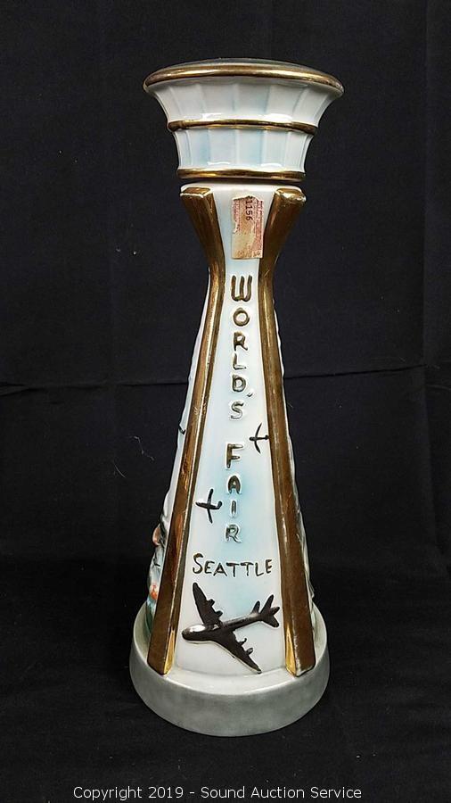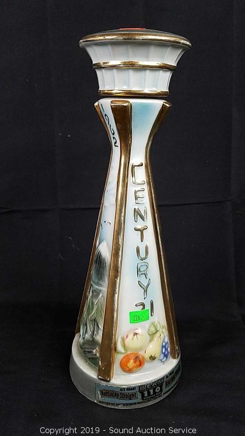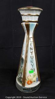 Bottle holder has mahogany base, works, 11" H. Decanter is Century 21 Jim Beam 1962, 13" H.