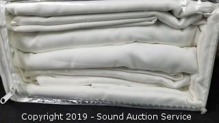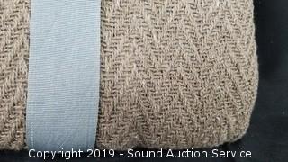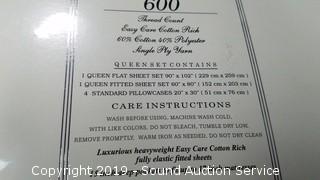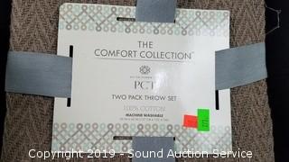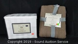 Sheet set is white (1 flat, 1 fitted, 4 pillowcases), appears new. Throw is Comfort Collection, 100% cotton, 50" x 60".