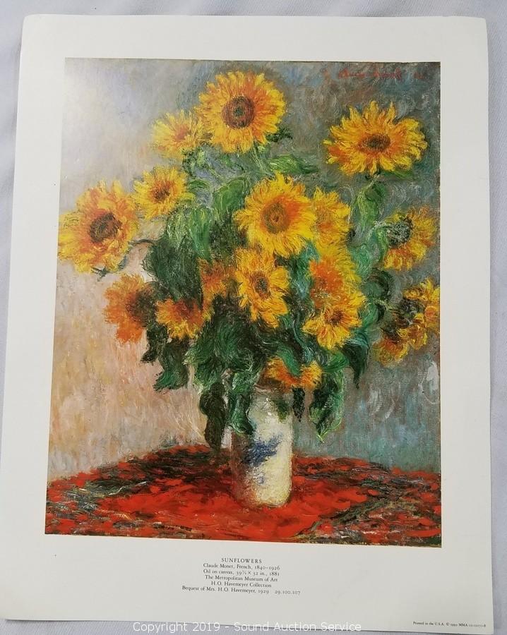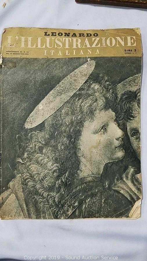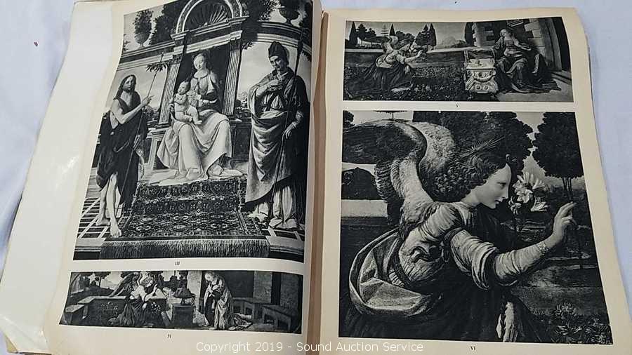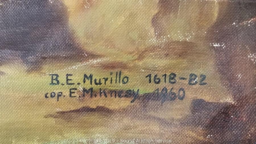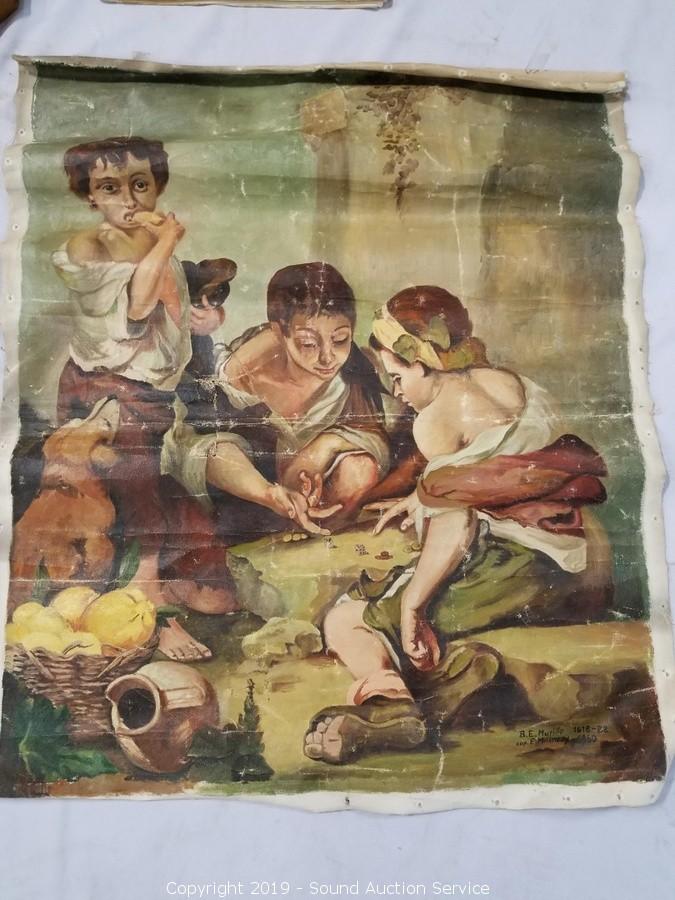 Includes: 1939 Leonardo Illustration Book, Nude Scene of Goddess & Cherubs 21" x 17" (Looks old, do not see a name), R. Atkinson Fox Print, and Original Oil on Canvas Street Kids Gambling 27" x 23" (Marked "B. E. Murillo 1618-B2 Cop E. M. Knesy 1960", has a couple holes in the canvas), Needlepoint Quote, and Sunflower Print.