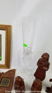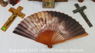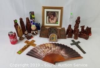 Includes: Laser Etched Crystal Paperweight, Crucifixes, Fryer Tuck Shaker & Sugar Dish, Signed France Crystal Champagne Glass, Cherub Fan, Cherub Artwork, Rosary, and Carved Wood Nativity Scene.