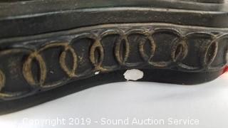 Has a small 1/2" chip in the front. Approx. 14" H. Works.