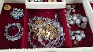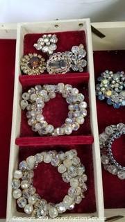 Jewelry box is locking, with key, approx. 6" H, 15" W, 9.5" D. Some signed, some are damaged, lots of rhinestone jewelry. The mirror on the jewelry box has a crack.