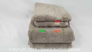 You get (2) 16" x 30" hand towels and (2) 13" x 13" wash cloths. Tan color. Some loose threads.
