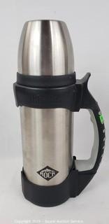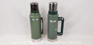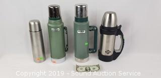 Includes: The Rock Thermos, 2 Stanley Thermoses, and Stainless Steel Push Button Thermos. Approx. 10.5" to 14" H.