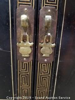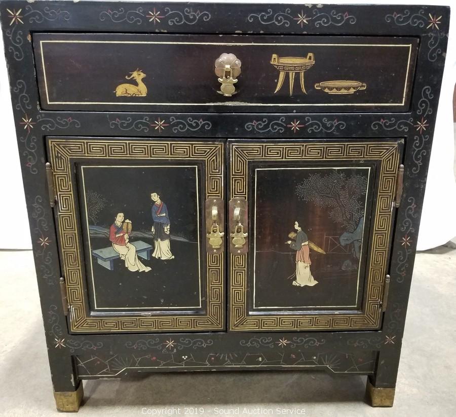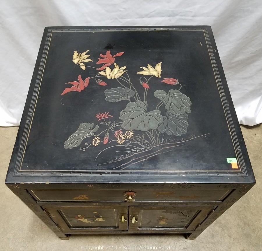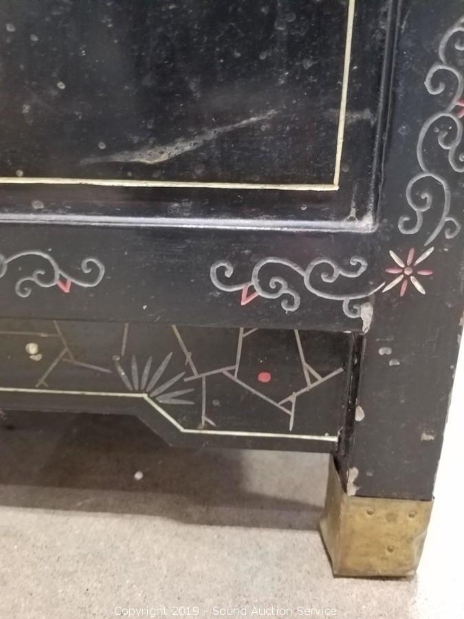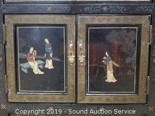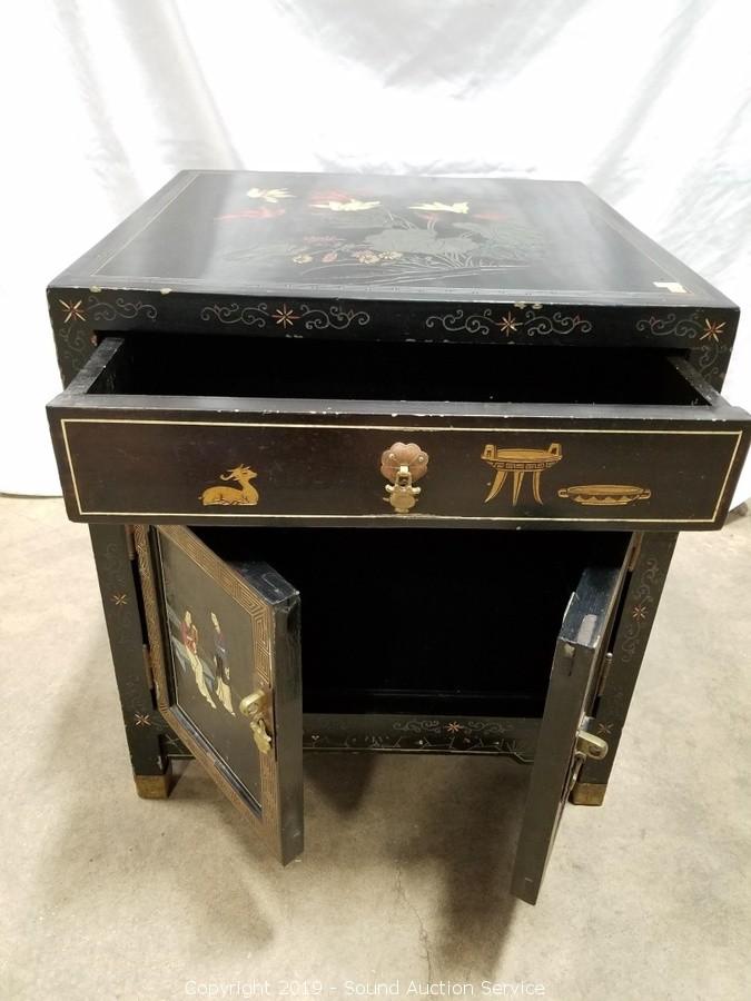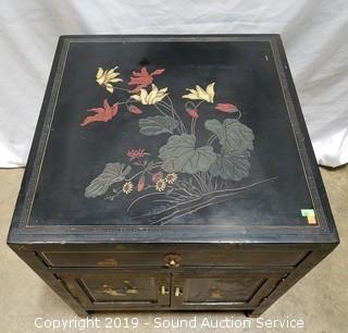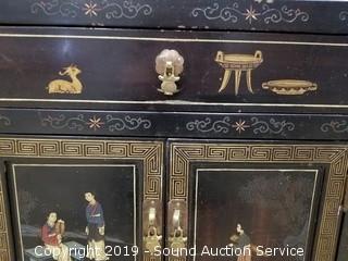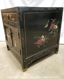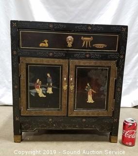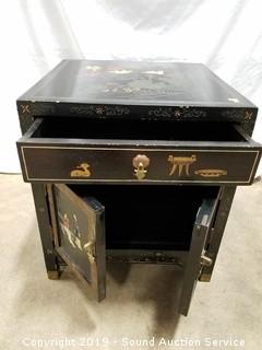 All of the images are carved and painted. Brass accents, black enamel finish (some chipping), very ornate detail. Has single drawer and lower cabinet, lower cabinet has a place for a padlock. Approx. 22" H, 20" x 20".
