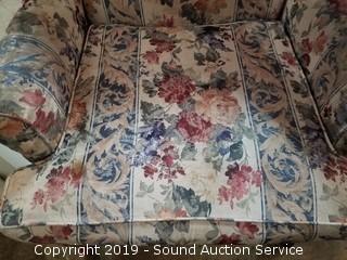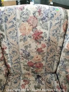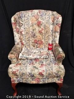 Some damage to the fabric and arms. Comes with a 4ft x 4ft 8" piece of matching fabric. Chair is approx. 44" H, 30" W, 22" wide seat.