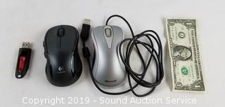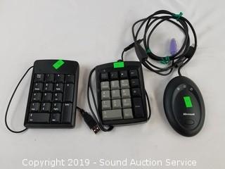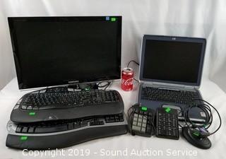 Includes: 2 keyboards (Wireless Microsoft and Logitech Wireless Wave Combo MK550 w/manual (Does not have the USB transmitter)), 2 USB number pads, Bem wireless speaker, and Samsung 22" LCD monitor Model 2253LW, 3 external hard drives 1tb and 230gb, HP Laptop with windows xp (unknown condition), iGo Juice 12v AC Adapter.