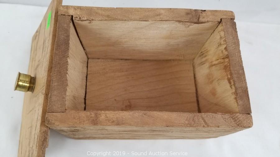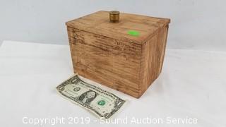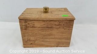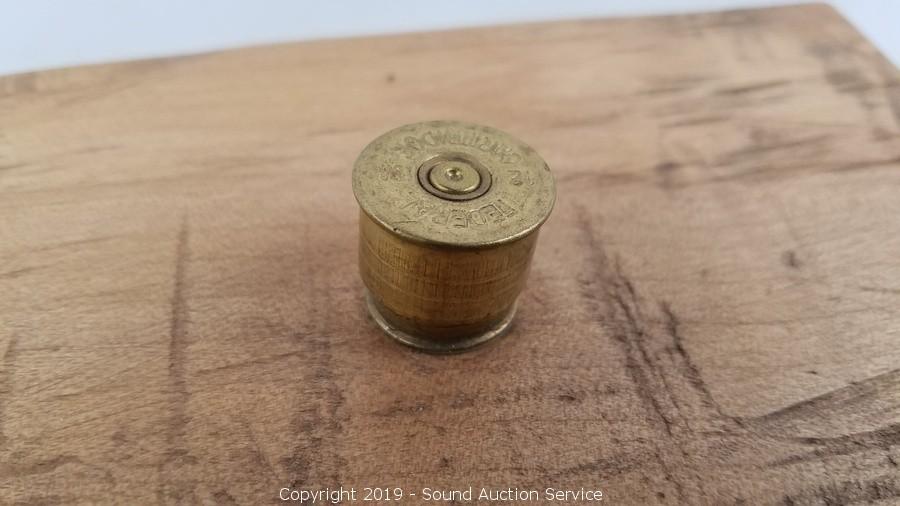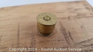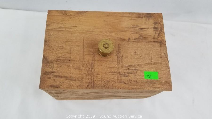 Lid has a shotgun shell handle. Approx. 5" x 7-1/4" x 5".
