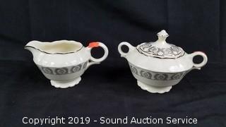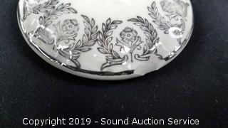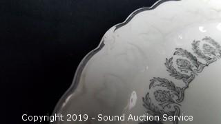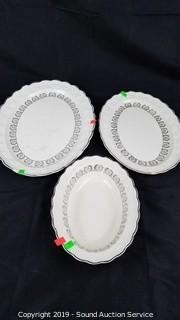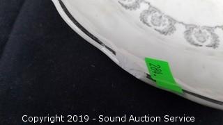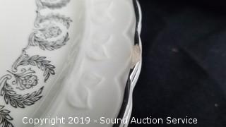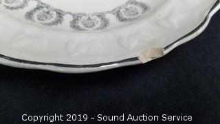 Includes: 4 teacups, creamer, sugar dish (chip on the lid), 6 saucers, 6 salad plates (one has a chip), 6 dinner plates (one has a chip), (6) 5-1/2" bowls, 9.5" serving bowl, 12" and 14" platters (both have chips).