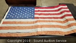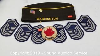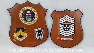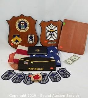 Plaques are Air Force. Includes: VFW military hat, 6 Air Force Chief Master Sergeant patches, vintage ephemera, and 3ft x 5ft American flag (one of the stripes is torn).