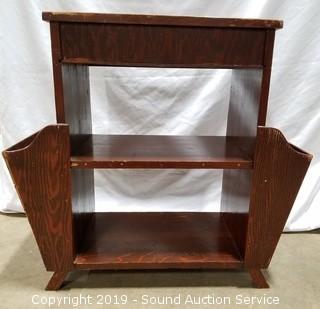 Magazine rack on both sides, one of the sides has come free on the right side. Some wear, scuffs and scrapes to the finish. Solid wood construction. Approx. 27" H, 29" W, 12.5" D.