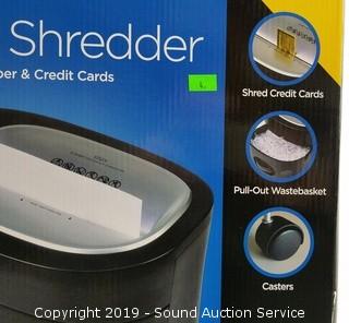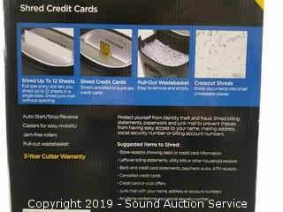 Shreds up to 12 sheets of paper and credit cards, on casters, pull out waste bin. Model 1212X.
