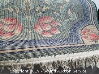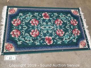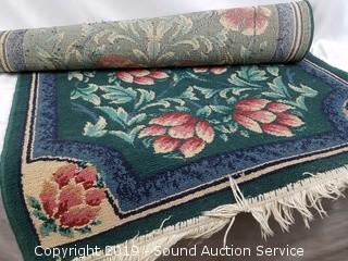 Includes: Beaulie Home Fashions 28" x 90" Floral Runner Cameo Pattern. Made in USA. Part of the trim is damaged. Approx. 1". Accent Rug is 56" x 32", couple minor stains.