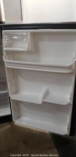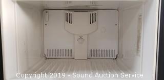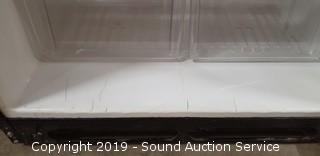Has one adjustable shelf. One bin is cracked and door is missing the rails. Black and stainless finish. Tested, works. Approx. 66" H, 30" W, 30" D.