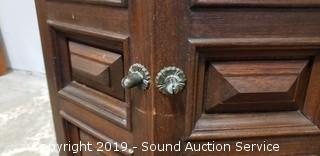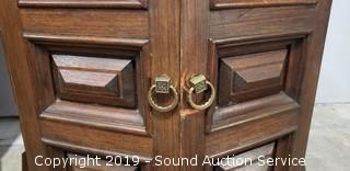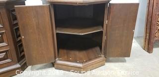 Some wear to the finish. One has some peeling to the veneer. Each one has doors with adjustable height shelf. Approx. 22" H, 21" diameter.