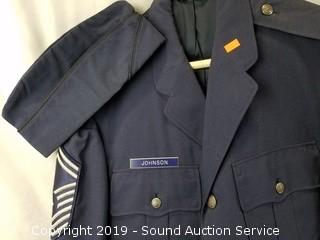 Has Chief Master Sergeant patches. Includes: Long sleeve shirt, jacket and hat. Size 44 XL. In good condition, some fading.