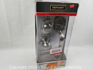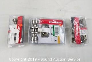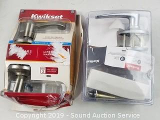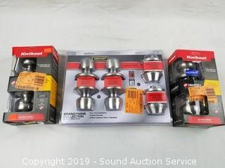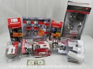 Brushed nickel finish. Unknown condition. Includes a front entry handle set, a hall/closet, a bed/bath, 2 combo packs knobs & deadbolts, a keyed entry, 3 separate keyed entry knobs.