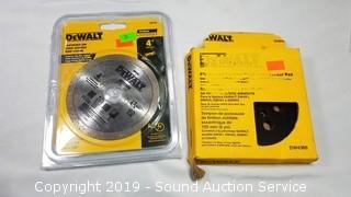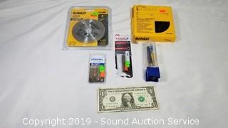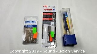 Includes: DeWalt 4" Continuous Rim Blade, Lenox 5/16" Diamond Tipped Bit, Dremel 2.1mm Diamond Bit, DeWalt 5" Random Orbit Palm Sander and Irwin 3/8" Bit.