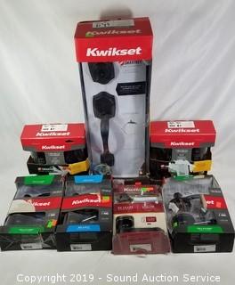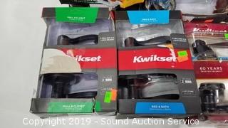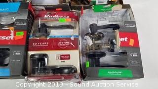 Contains 7 sets, antique bronze finish. Includes 2 bed/bath, 2 hall/closet, 2 combo packs knob and deadbolts, and a front entry handle set. All complete.