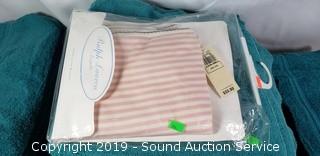 Discription: Also comes with NIP Ralph Lauren receiving blanket. Towels are green and purple. Phoenix white and chrome tumbler, cotton jar, lotion pump, and soap dish.