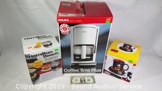 Discription: Includes: Krups Coffee Time Plus 12-Cup Electronic Coffee Maker, Hamilton Beach Breakfast Sandwich Maker, and Mickey Mouse Mug w/Warmer.
