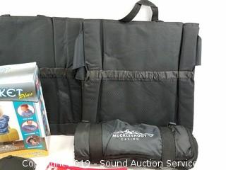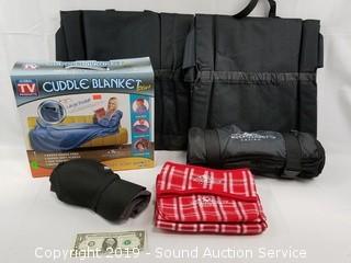 Discription: Includes: Hat & Shirt Size Large, NIB Cuddle Blanket, Pink Blanket w/Bag, 2 Chair Pads, and Travel Blanket.