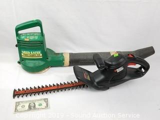 Discription: Hedge trimmer works, trigger is a little sticky. Blower has a custom blower attachment and screen on the bottom.
