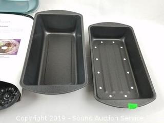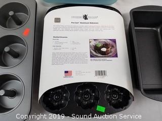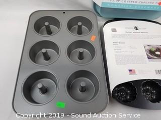 Discription: Includes: Nordicware Cast Aluminum Bunt Brownie Pan, Calphalon 12-Cup Muffin Pan w/Travel Lid, Loaf Pan, and 2 Donut Pans.