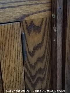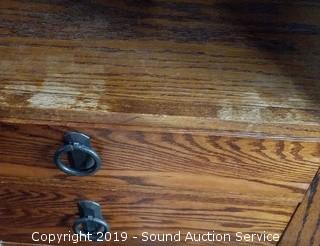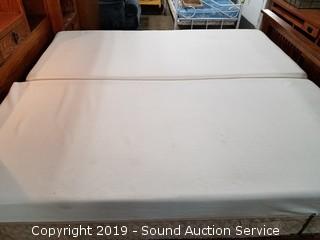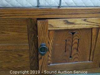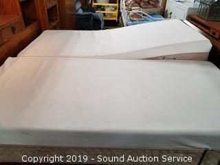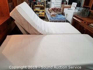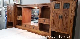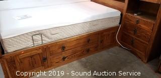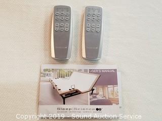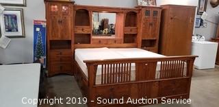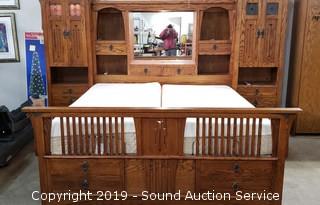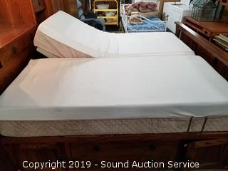 Discription: Beautiful oak finish with dresser back. Comes with 2 remotes, each side adjusts and massages separately. Sleep Science Advanced Technology Comfort System, comes with users manual. Memory foam pillow top mattresses. Lighted headboard with cabinets and drawers, drawers and cabinets around the base of the bed. Overall approx. 99" L, 11ft 2" W, 78-1/2" H. Bed itself is approx. 90" W. Some wear on the headboard and footboard looks to have been repaired on the right side of the bed.